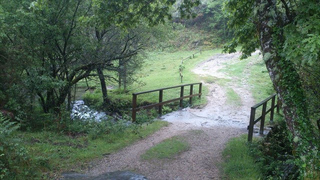 Preciosa ruta promovida por la Comunidad de Montes de Santiago de Covelo. Esta ruta está señalizada pero en vez de contar con las clásicas señales blancas y amarillas de pequeño recorrido, está marcada con postes de madera en los cuales se ve un lobo, a veces la huella del lobo, en color rojo, y encima del poste una flecha blanca indicando la dirección, única, que debe tomar el caminante. Quiero decir que aunque es una ruta circular las marcas sólo indican la dirección en el sentido antihorario. Y ese es el recorrido que hemos hecho nosotros, saliendo del barrio de O Castro, en Covelo. Y comenzamos ascendiendo siguiendo el cauce del río Ponte Piñeiros durante un buen trecho. Señalar también que durante todo el recorrido vamos pisando sobre senderos de tierra o empedrados, y maravillándonos con toda la belleza que la madre naturaleza nos ofrece en estos parajes. No sólo las impresionantes cascadas y los rápidos que el río nos ofrecía en este invierno tan lluvioso, sino también la frondosidad de los árboles con pinos, robles, castaños, abetos, alcornoques... Y los elementos arquitectónicos aportados por la mano del hombre a lo largo del tiempo: molinos, fuentes, puentes, cruceiros, petroglifos, merendero, un castro enterrado sobre el que hay infinidad de leyendas... Os deseamos que os guste tanto como a nosotros y recordad que el respeto por el medio natural, flora y fauna es muy importante a lo largo de este paraíso.