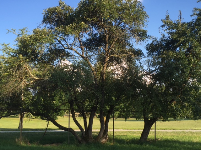 This row of crabapple trees (Malus sp.) will make a pretty sight in spring when they bloom or in fall when they bear their colorful fruit. This species is not native to NJ, but is frequently planted as an ornamental. Crabapple is native to Eurasia and is a member of the rose family Unfortunately, the fruits are not sweet like those of apple, and are in fact, extremely sour due to a high content of malic acid. They often persist on the shrub through the winter.
