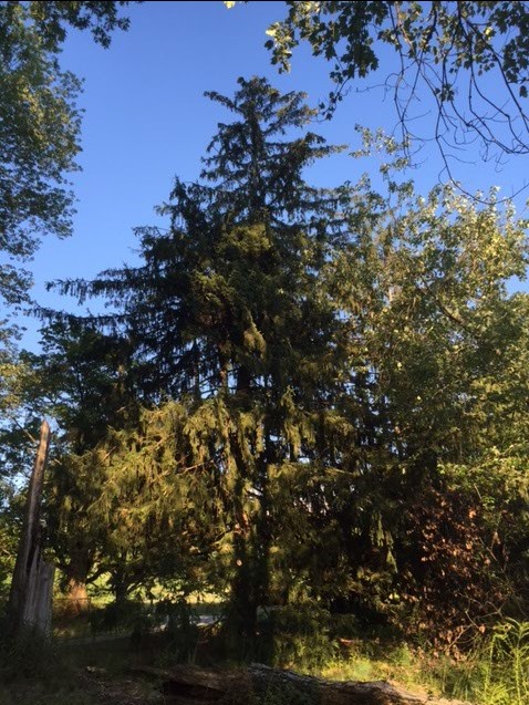 As you approach this site, you’ll just be passing a group of very large specimen Norway Spruce trees (Picea abies). This species was brought by early European settlers to North America as a reminder of their homelands. While not native to NJ, this tree has been widely planted and can be recognized by its reddish, scaly bark, large cones that start green and mature to brown, and four-sided needles. The seeds from the cones are an important source of food for many animals, especially squirrels. This species is famously used in many cities for Christmas trees, including in New York City and Washington D.C. It can grow quickly, especially when young, even up to 3 feet a year. If you look closely at the trunk, you’ll see many areas covered in sticky spruce sap. This indicates areas of injury or insect invasion that the tree is attempting to heal. The sap can also be used to make varnish. The wood of Norway Spruce has good resonance characteristics and has been used to make the sound boards in violins and guitars. “Spruce Beer” used to be made from the shoot tips on the branches and used to treat scurvy due to its high vitamin C content.