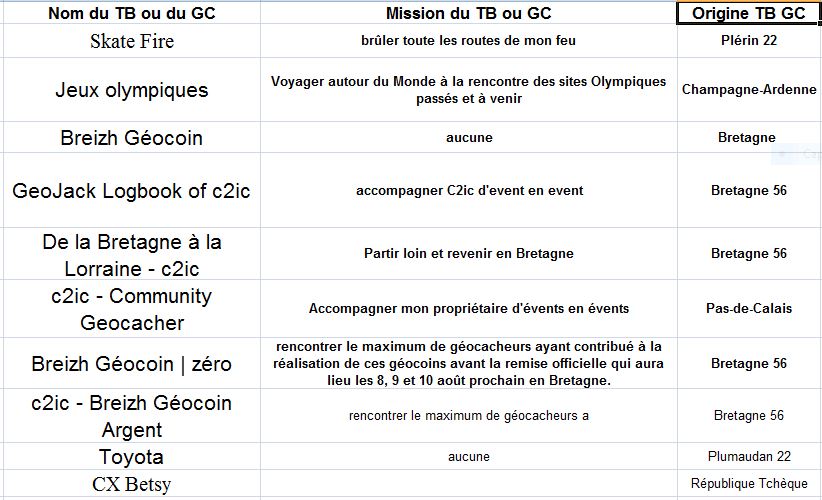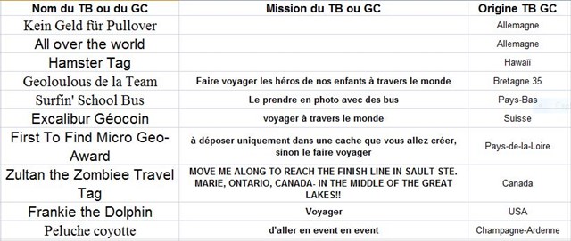 Les objets voyageurs et travels bugs déposés, leur mission ou leur région ou pays d'origine.