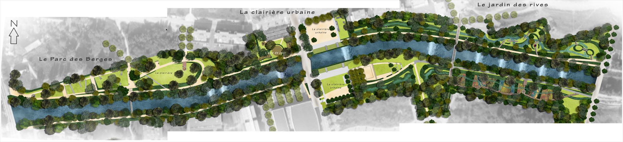Dans le Jardin des Rives, l’ambiance se fait plus aventurière. Dessiné par les noues ondulantes de la Thur, il est un cheminement aléatoire de butte en butte par un jeu de passerelles et de gués. De temps en temps on découvre un banc ou une table de pique-nique où l’on peut marquer une pause pour apprécier cette ambiance paisible. Des placettes greffées sur les berges de la Thur offrent des points de vue sur ce paysage naturel, à la faune et à la flore typiques des milieux humides. Ce jardin se veut un déambulatoire botanique et pédagogique.