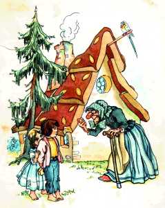 Aber gerade als Hänsel vom Dach ein Stück Lebkuchen abgebrochen und Gretel sich an einem Mailänderli von einem Fensterladen vergangen hatte, tönte es von innerhalb der Hütte: Knusper! Knusper! Knäuschen! Wer knuspert an meinem Häuschen?" Und der schlagfertige und gewitzte Hänsel antwortete spontan: "Der Wind! Der Wind! Das himmlische Kind!" Dann öffnete sich die Tür und eine alte, kleine Frau mit Warzen auf der Nase trat vor die Hütte und kicherte vor sich hin.....!