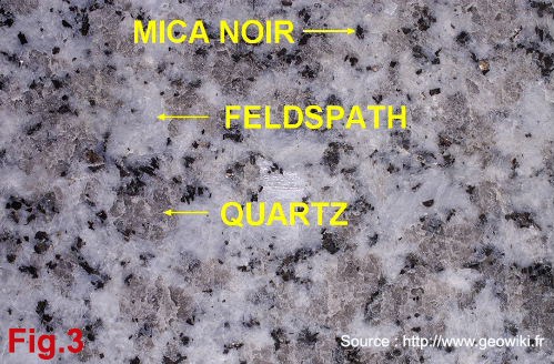 When the magma’s ascent stops (because the density difference is not sufficient or because of the nature of the surrounding rocks) it solidifies during slow cooling. A granitic pluton whose shape looks like an inverted drop of water remains trapped in the subsoil (Step 2 of Fig.1). The cooling that lasts tens of thousands of years allows the formation of crystals visible to the naked eye (called phenocrystals). Granite has an holocrystalline texture, that is to say that it is fully crystallized. In the granite from Bécon-les-Granits we can easily observe at least 3 characteristics of this rock minerals : mica, feldspar and quartz (in the order of their appearance during crystallization ). See Fig.2and Fig.3.
