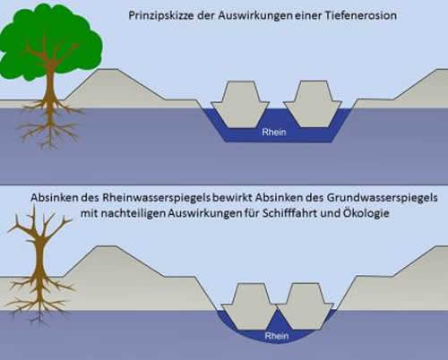 Wie jedes natürliche Flusssystem verändert auch der Rhein immer wieder seinen Flusslauf. Diese Dynamik ist das Ergebnis eines Wechselspiels zwischen Erosion und Anlandung. Doch durch die Eindeichung des Rheins ist eine Ufererosion (Seitenerosion) des Flusses kaum noch möglich. Dies hat zur Folge, dass der Rhein sein Bett nur noch in vertikaler Richtung verändern kann. Die daraus resultierende Erosion (auch Sohlerosion) stellt eines der größten Probleme von frei fließenden Gewässern dar. Sohle und damit Niedrigwasserspiegel des Rheins sinken noch heute ständig ab. Die Folgen sind Einschränkungen der Fahrwasserbreite und -tiefe, insbesondere bei Niedrigwasser, Absinken des Grundwassers in Ufernähe, ökologische Schäden an Flora und Fauna der Rheinaue und "Unterhöhlung" der Bauwerke am- und in der Nähe des Flusses. Seit vielen Jahren praktizierte Maßnahmen wie das Auffüllen der Sohle an besonders kritischen Stellen mit lagestabilen Steinen bzw. Zugabe von beweglichem Material bekämpfen nur die Symptome und sind zudem sehr kostenintensiv.