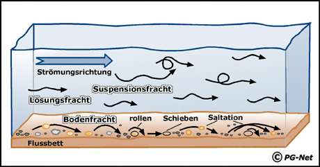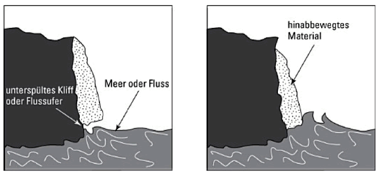 Wir wissen, dass Strömungen und Fliessgewässer Sedimente an hängenden Uferbereichen auswaschen oder erodieren können. Diesen Erosionstyp bezeichnen wir als Unterspülung oder Unterhöhlung. Er erzeugt einen steileren Hang - Überhang - an dem das Material abrutschen kann. Die nachfolgende Grafik veranschaulicht, wie eine Strömung oder ein Fluss Sedimente, die einen Hang oder ein Ufer stützen, auswäscht. Diese Erosion durch strömendes Wasser, die Massenbewegungen zur Folge hat, bezeichnen wir als Unterspülung oder Unterhöhlung. Kann der Rhein sich besonders breit machen, fließt er zu langsam und lagert sein Geschiebe ab: hinderliche Verlandungen im Strom - bei Hochwasser auch auf den Ufern - entstehen. Engt man ihn ein in seinem Bett, macht er Tempo und nimmt von seinem Grund Geröll, Kiesel und Sand in viel zu großer Menge auf (Erosion), die er dann bei verlangsamter Strömung wieder an unerwünschten Stellen ablädt. Von solcher Last befreit, nimmt das Wasser mit neuer Kraft anschließend wieder Geschiebe auf und greift dabei die stromabwärts gelegene Flusssohle erneut an; ... man spricht hier also von einer Sohlerosion.