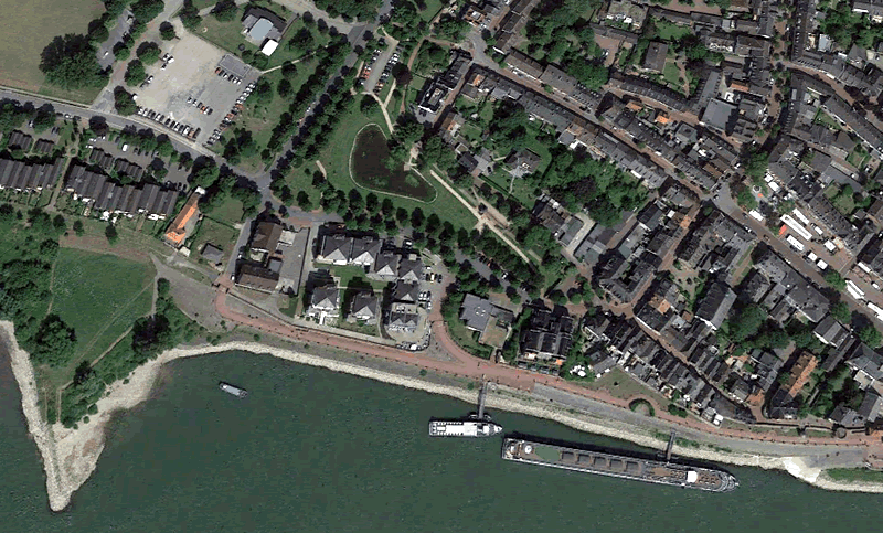 Zwei Formen an der gerundeten Stadtmauer sind nachträglich entstanden und zeigen ganz deutlich, warum gerade in dieser engen Linkskurve des Rheins ein Gefahrenbereich ist.