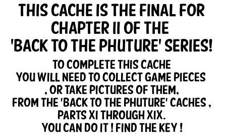 Bring along your special equipment --> The 9 game pieces from Back to The Phuture parts XI thru XIX (remembering from which BTP cache they came), a QR reader, some water, positive energy, and head to the location delivered in the video, when you CLICK THE LARGE PHOTO above. The password to the video is the same password that you use for the BTPX video. (the cache page puzzle for BTPX takes you to the spot with the password) USE THIS PASSWORD FOR ANY VIDEOS DURING THIS CACHE.