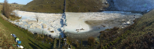 Rainwater and groundwater percolate through this waste and this forms a highly alkaline (pH >12) calcium hydroxide-dominated liquid, which travels through the spoil tip and emerges from its base into the Brook Bottom valley. Here, contact with carbon dioxide in the atmosphere and mixing with local bicarbonate water leads the development of an extensive area calcium carbonate deposits over a large area of the valley bottom downstream of the spoil tip.