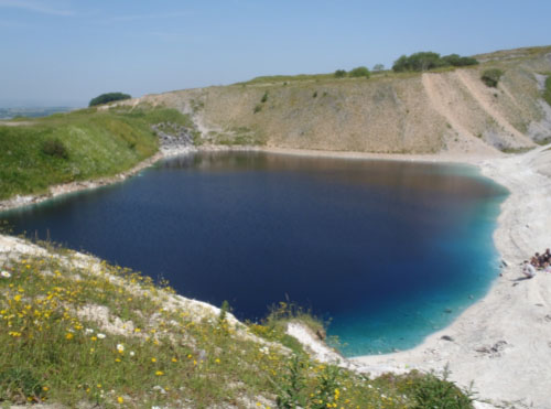The blue colour of the water is derived from the scattering of light by finely-dispersed calcium carbonate precipitated within the water column. The flooded base of the disused limestone quarry is surrounded by burnt lime waste spoil heaps on three sides (foreground, left and right on photo), and by limestone spoil (in the distant background of photo).