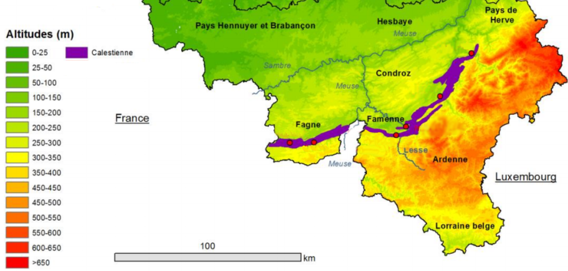 EN: The Calestienne is a geological region of Belgium, slightly overlapping in French territory, characterized by its limestone