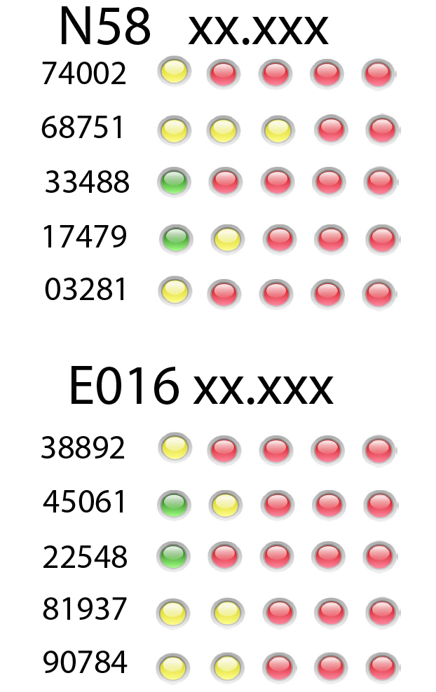 Mastermind. Grön betyder att någon siffra är på rätt plats, gul att den finns med men är på fel plats. Röd innebär att det är helt fel.