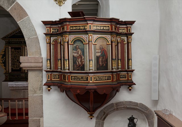 Prædikestolen er fra 1590-1600. Den bærer årstallet 1612. Den menes at være fra samme værksted som Prædikestolen i Nors Kirke. Den har et karnapfremspring med fire arkadefelter med evangelisterne. Dertil kommer to smalle sidefelter uden motiver. Felterne er adskilt af kanelerede søjler med korintiske kapitæler og bladskeder. Søjlerne ses tydeligt på billederne af Matthæus og Johannes. Evangelistbillederne er udført af Rasmus Jensen Thrane i 1711, som fik 18 Rdlr for at staffere prædikestolen og belægge den med bladguld.
