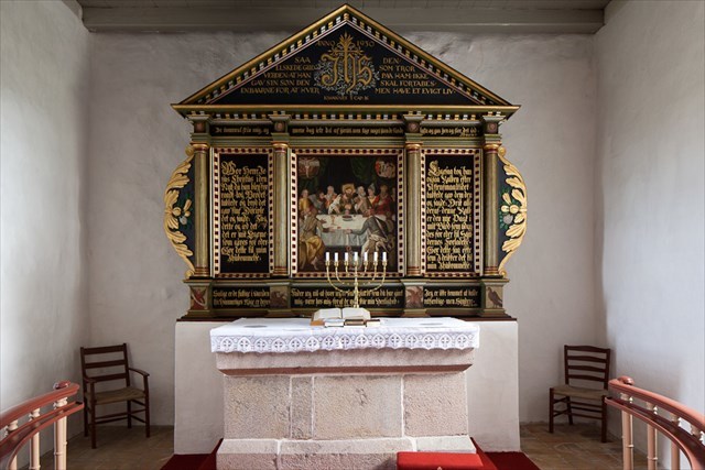 Altertavlen er fra o. 1600. Storfelterne adskilles af fire toskanske søjler. Gavlfeltet spænder over hele tavlens bredde. Vingerne har volutter for oven og for neden samt akantusblade og frugtklaser. Stafferingen, der er fra 1930, er baseret på den oprindelige staffering fra 1612. Alterbilledet, der forestiller nadveren, er det oprindelige. I de to øverste hjørner er der indsat små billeder af korsfæstelsen og gravlæggelsen. På postamentfremspringene ses de fire evangelister.