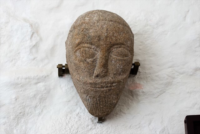 Da kirkens sydmur blev omsat i 1974-75, fandt man et mandshoved i granit. Det er opsat i tårnrummet.