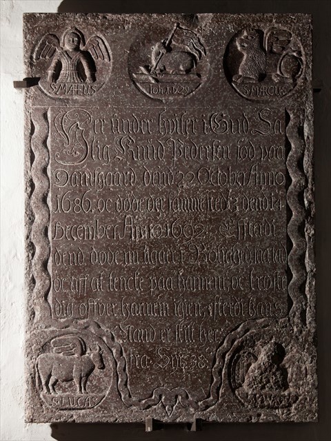 Gravsten opsat på korets sydvæg over Knud Pedersen, født 1692 på Damsgaard.