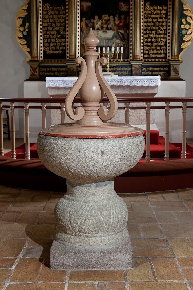 Døbefonten er romansk. Kummen er ganske flad. Den står på en rund fod med en høj hals. På foden findes trekantfelter.