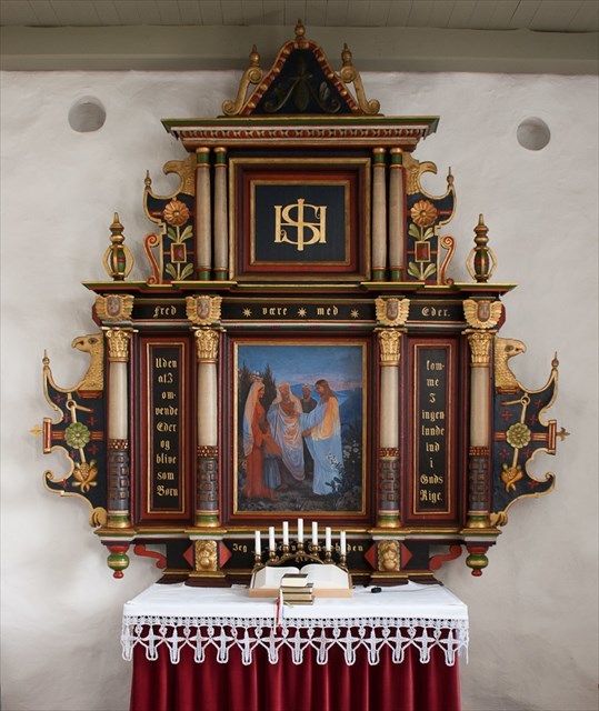 Alterbilledet er malet af E. Bayer i 1905: Jesus i samtale med to mænd og en kvinde.