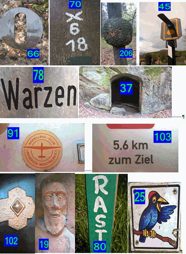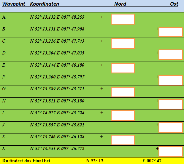 An den 12 Wegpunkten findet man jeweils eines der 12 Bilder. Durch die Übertragung der Zahlenwerte auf den Bildern in das Formular lassen sich die Finalkoordinaten berechnen.