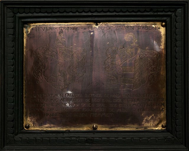 Messingplade med to adelsvåben og indskrift: