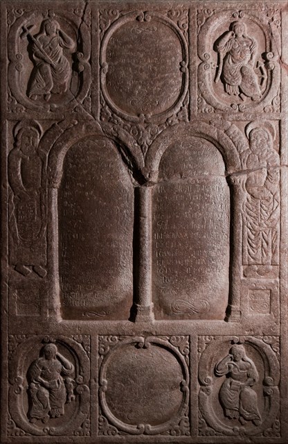 Gravsten fra o. 1750 og nu opstillet i våbenhuset. Christen Sørensen, født 1748, død 15. marts 1831, og hustru Johanne Nielsdatter, død 1815. Det er en rød ølandsk kalksten, der er hugget o. 1750 af Barok-Mesteren. Midt i stenen to arkadefelter. Til venstre Moses med lovens tavler og til højre Kristus med verdenskuglen. I hjørnerne dyder indrammet af volutbøjler.