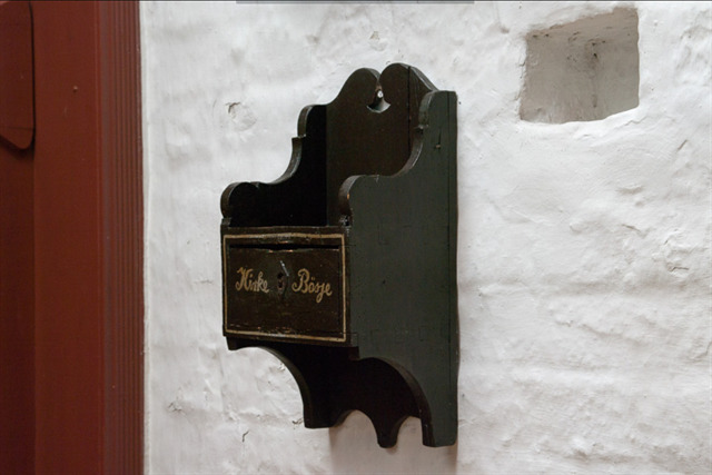 Kirkebøssen er ophængt lige inden for indgangsdøren på nordsiden.