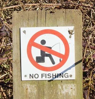 Because the posts were uprooted and the container fell into the hole where it stood, the cache was temporarily known as “Fishing (was?) Prohibited….” and positioned a few hundred feet away. The posts were then replaced, so the cache reverted back to its original name and place, only for the signs to be vandalised once more. The present location has been static for some time.