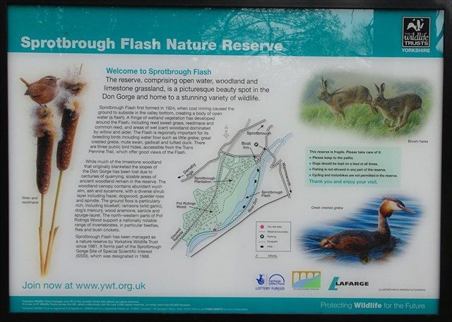 Sprotbrough Flash came into existence due to subsidence caused by coal mining, the depressed ground filling to form the lake visible today. There is the opportunity to view the usual water or waterside birds, the lake usually being populated by cormorant, heron, mallard, tufted duck etc., however great crested grebe can often be seen and even osprey have been known to visit.
