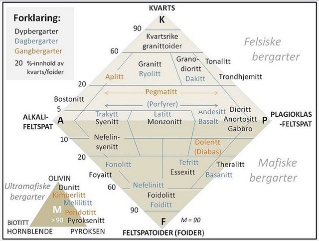 B. Se på den orange streken i diagramet (diagram kjente magmatiske bergarter) Hvor mange % feldspar har vi i fjellet ved gz? Er feldspar`en lys eller mørk i fargen? Legg % mengden feldspar sammen med svaret ditt fra første spørsmål i oppgave A og fortell hvor du havner i diagrammet.