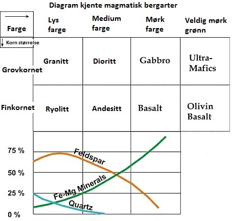 B. Look at the orange line from the chart (diagram kjente magmatiske bergarter) How many % feldspar, is it at the mountain wall at gz? Is the feldspar light or dark in color? Add the % amount feldspar along with your answer from the first question in task A and tell where you end up in the chart.