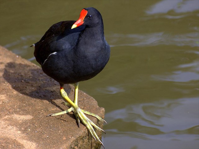 The Common Gallinule (Gallinula galeata), has long toes that makes it possible to walk on soft mud and floating vegetation. The toes have no lobes or webbing to help in swimming, but is a good swimmer none the less. It is the most widely distributed member of the rail family, inhabiting marshes and ponds from Canada to Chile, from northern Europe to southern Africa, and across Asia to the Pacific. It is dark, with a white flank stripe, red bill, and forehead and was formerly called the Common Moorhen. I saw one once right in front of the viewing platform, about 10 feet away.