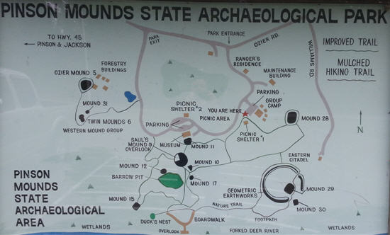 Pinson Mounds is open from 7am until sunset. Park at Picnic Area #1 complex. Continuing your stroll allows you to see lots of trees. This little area is dominated by a sweetgum tree. Look close!!
