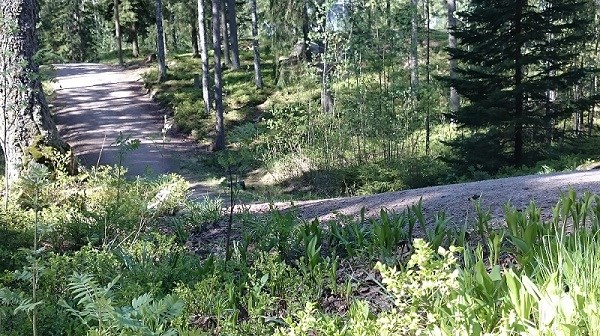 1. Lähtöpisteeltä löydät kiven - ja näet reunavallimoreenia sen pohjoispuolella. Kivi on Karjalasta tullut Viipurin rapakivi, joka on viborgiittia. Tutki sen pintaa. Viipurin rapakivet syntyivät, kun vuorten kulumisen jälkeen tapahtui postorogeenisia pulpahduksia 1650 miljoonaa vuotta sitten. Näitä kiviä kulki mannerjäätikön edustalla jäävuorten mukana Kymenlaakson-Viipurin alueelta. Viborgiitti on helppo tunnistaa, ja sellaiseen voi tutustua myös Heurekan kivipuistossa. - Arvioi lähtöpisteen kiven kokoa ja jatka sitten kulkuasi tietä myöten: