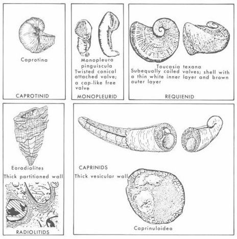 Rudists are a group of marine molluscs with two shells or valves (bivalves) that existed from the Late Jurassic to the Late Cretaceous periods. Their valves were unequal and one of them were attached to the sea floor. They resided in shallow, calm and warm marine waters. During the time of dinosaurs reefs were mainly built by rudists, not by corals. They went extinct at the end of the Cretaceous period during the Cretaceous–Paleogene extinction event, the same mass extinction event that wiped out dinosaurs.