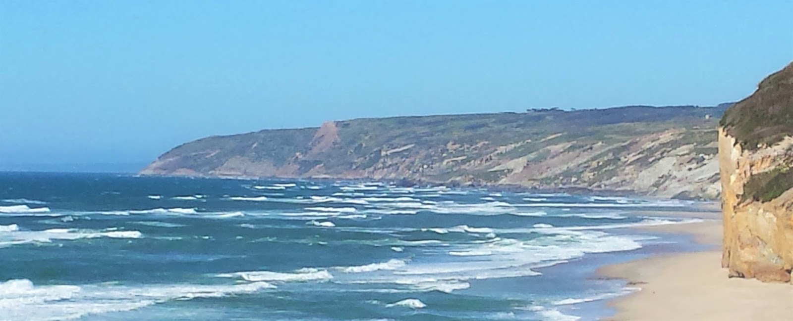 A costa é formada por arribas areníticas, onde é possível observar a ação do mar. Aqui e ali existem camadas de carvão intercaladas no arenito. Olhando o horizonte podemos observar Peniche, o Baleal, as Berlengas, a rocha do Gronho e a costa da Serra do Bouro até Salir o Porto.