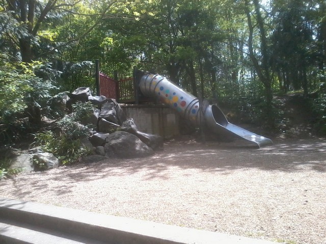 Cette aire de jeu bien intégrée dans l'environnement propose des toboggans, balançoires, toiles d'araignée pour les petits mais aussi des équipements de remise en forme ainsi que quelques équipements sportifs (panneaux de basketball, tables de tennis de table, ...).