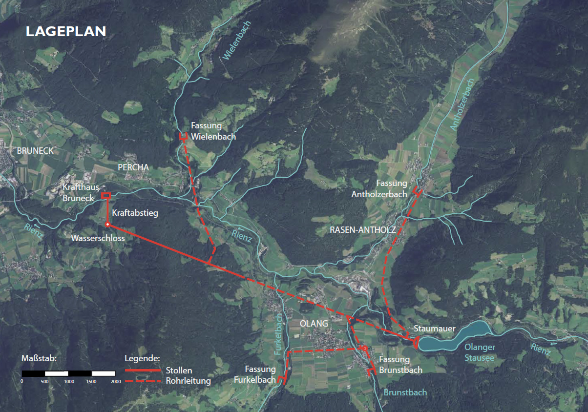 The dam Of Olang is part of the hydroelectric plant Olang-Brunico and uses the waters of the river Rienz and its inflows Antholz, Brunst, Furkel and Wielen. The plant lies in the municipalities of Welsberg, Olang, Rasen Antholz, Percha and Bruneck.