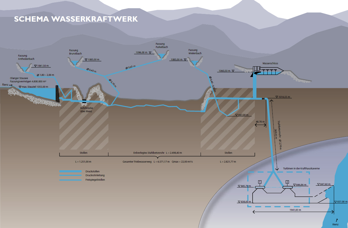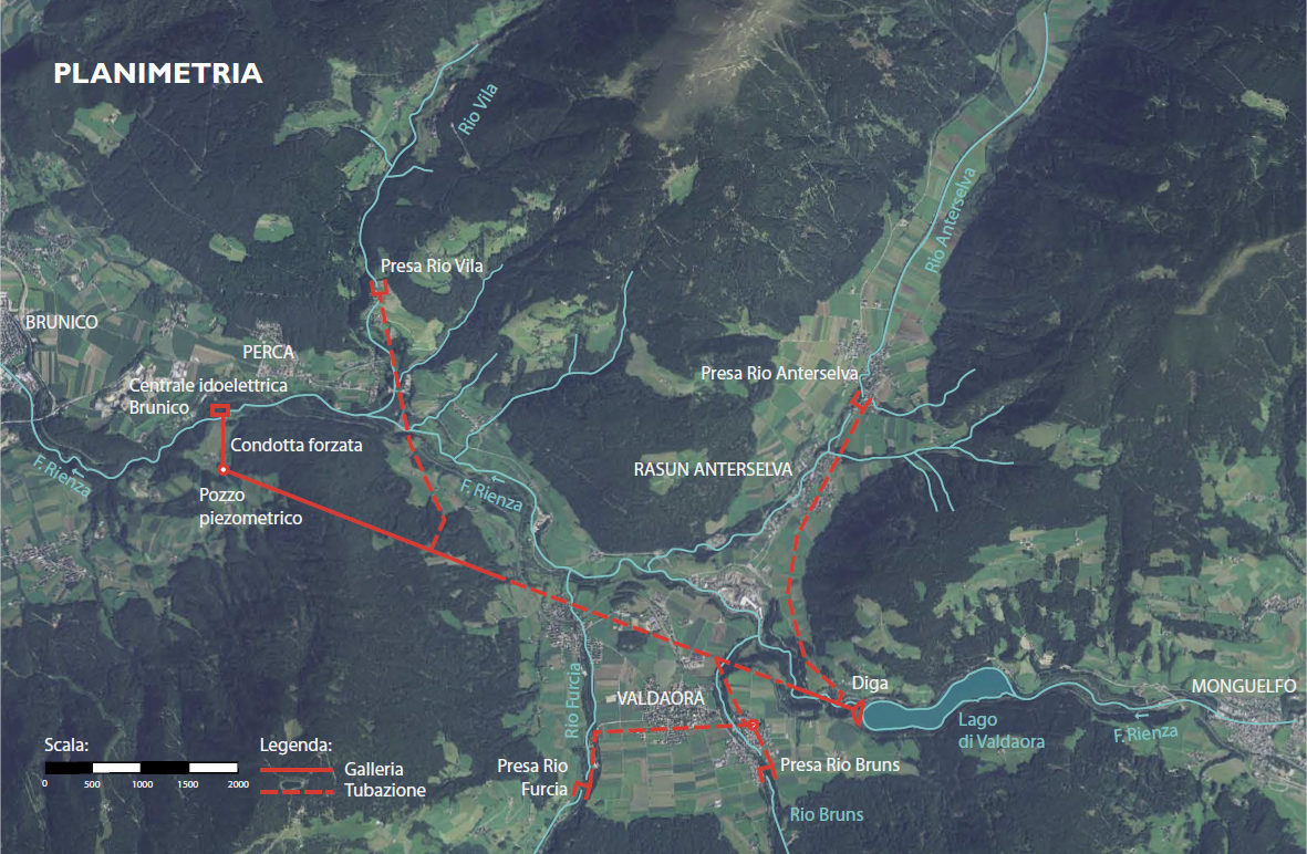 Die Anlage nutzt das Wasser der Rienz und ihrer Nebenflüsse Antholz, Brunst, Furkel und Wielen. Das verwendete Einzugsgebiet beträgt insgesamt 588 km², davon 430 km² vom Staudamm von Welsberg und 158 an die sekundären Entnahmen angeschlossen.