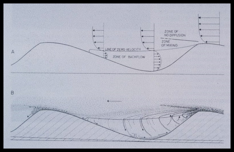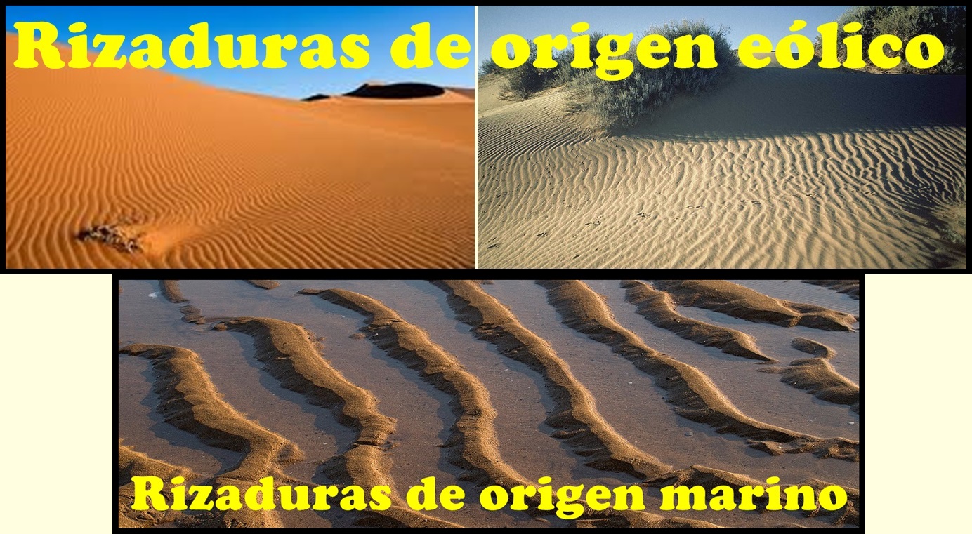 El aire y las corrientes de agua producen rizaduras de caras asimétricas, en tanto que las oscilaciones del oleaje forman otras que son simétricas.
