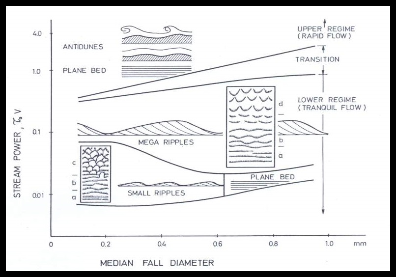 Campos de estabilidad de las estructuras sedimentarias ligadas a corrientes tractivas en función del tamaño de grano y de la energía de la corriente.