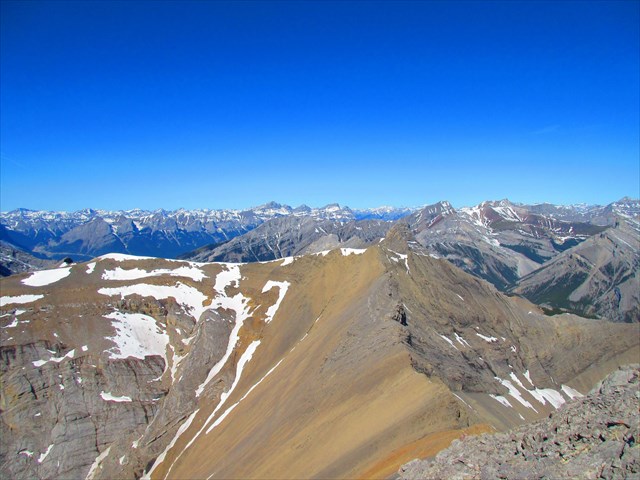 If this route isn't adrenaline pumping enough, there are several popular climbing routes as described in Chris Perry's Bow Valley Rock. The toughest of which is a 5.10a trad climb called "The Boulevard" which tackles the imposing south face! The SW and SE ridges both offer slightly more sane 5.5 trad climbs.