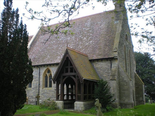 Dedicated to St. Michael, the present church was rebuilt in 1876 consisting of chancel, nave, north porch and vestry. It is in the 13th-century Gothic style with walls of brick faced with stone, steep-pitched tiled roofs, a stone bellcote at the west end, containing one modern bell, and a timber porch. The chancel has a small credence on the north, the pointed arch over which is apparently ancient. The piscina in the south wall has an old basin resting on a head corbel apparently of the 13th century. At the west end of the nave are preserved six encaustic tiles of fairly good design, found in the churchyard to the north of the church in 1896 and indicating an alteration in the site.
