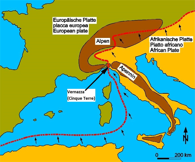 (siehe Bild: Plattentektonik / placca tettonica / plate tectonics).