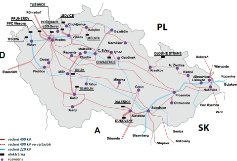 Dálkový přenos energie zajišťuje přenosová siť vedení velmi vysokého napětí. Linky propojují jednotlivé zdroje a transformační stanice, aby bylo možno operativně řídit přenos energie v závislosti na okamžité spotřebě elektřiny v různých oblastech i v případě poruchy na některé části sítě. Už od 60. let 20. století byla naše přenosová síť propojena s přenosovými soustavami tehdejších socialistických zemí. V roce 1995 byla naše přenosová síť propojena se západoevropskou soustavou UCPTE. V naší republice dnes máme přes 3000 km linek o napětí 400 kV a přibližně 2000 km linek s napětím 220 kV. Na mapce jsou červenou barvou znázorněny linky 400 kV, zelenou barvou linky 220 kV