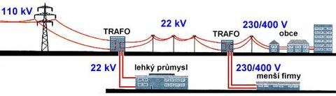 V transformační stanici se velmi vysoké napětí transformuje na vysoké napětí 110 kV, část elektrické energie se přivádí do velkých podniků těžkého průmyslu a do měníren zajišťujících napájení elektrifikovaných železničních tratí. Zbývající část se distribuuje k dalším spotřebitelům (lehký průmysl, města, obce), kde se transformuje na napětí 22 kV. K poslední transformaci na nízké napětí 230V a 400 V dochází v samotných podnicích, obcích a městských čtvrtích. Do našich domácností tak přichází elektrický proud nízkého napětí, který rozsvítí žárovku, dobije navigaci, anebo pohání elektromotor vysavače.
