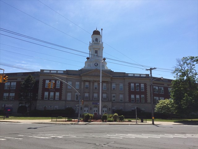 I placed this geocache to bring you to an impressive building that is across the street. I pass by this building frequently and always think that they don't build schools like this any more. The building is Sewanhaka High School and is one of 5 high schools in the Sewanhaka Central High School District. The name Sewanhaka translates to "Island of Shells" in English but I can find no reference as to why it was used as the name of the school.