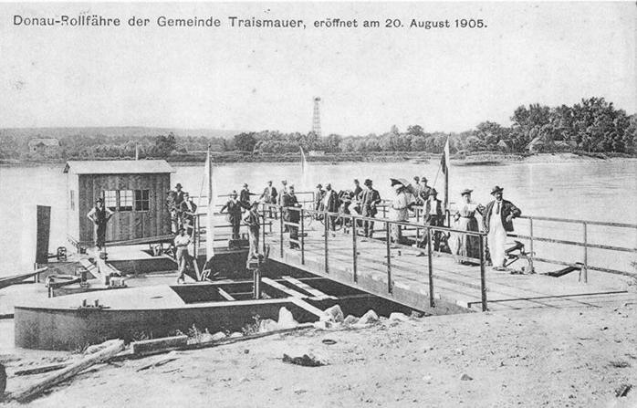 Am 28. Juni 1901 beschloß der Gemeinderat von Traismauer, die Überfuhr zu errichten und hierzu ein Stammkapital von 20.000 Kronen zu widmen. Ein Teil der Kosten wurde durch eine Effektenlotterie aufgebracht, ein Teil durch eine Subvention des Landtages und ein Teil durch einen Kredit finanziert. Die Gesamtkosten beliefen sich auf ungefähr 106.000 Kronen. Im Sommer 1905 waren die Arbeiten fertiggestellt, sodaß am 20. August dieses Jahres die Einweihung und Eröffnung stattfinden konnte.