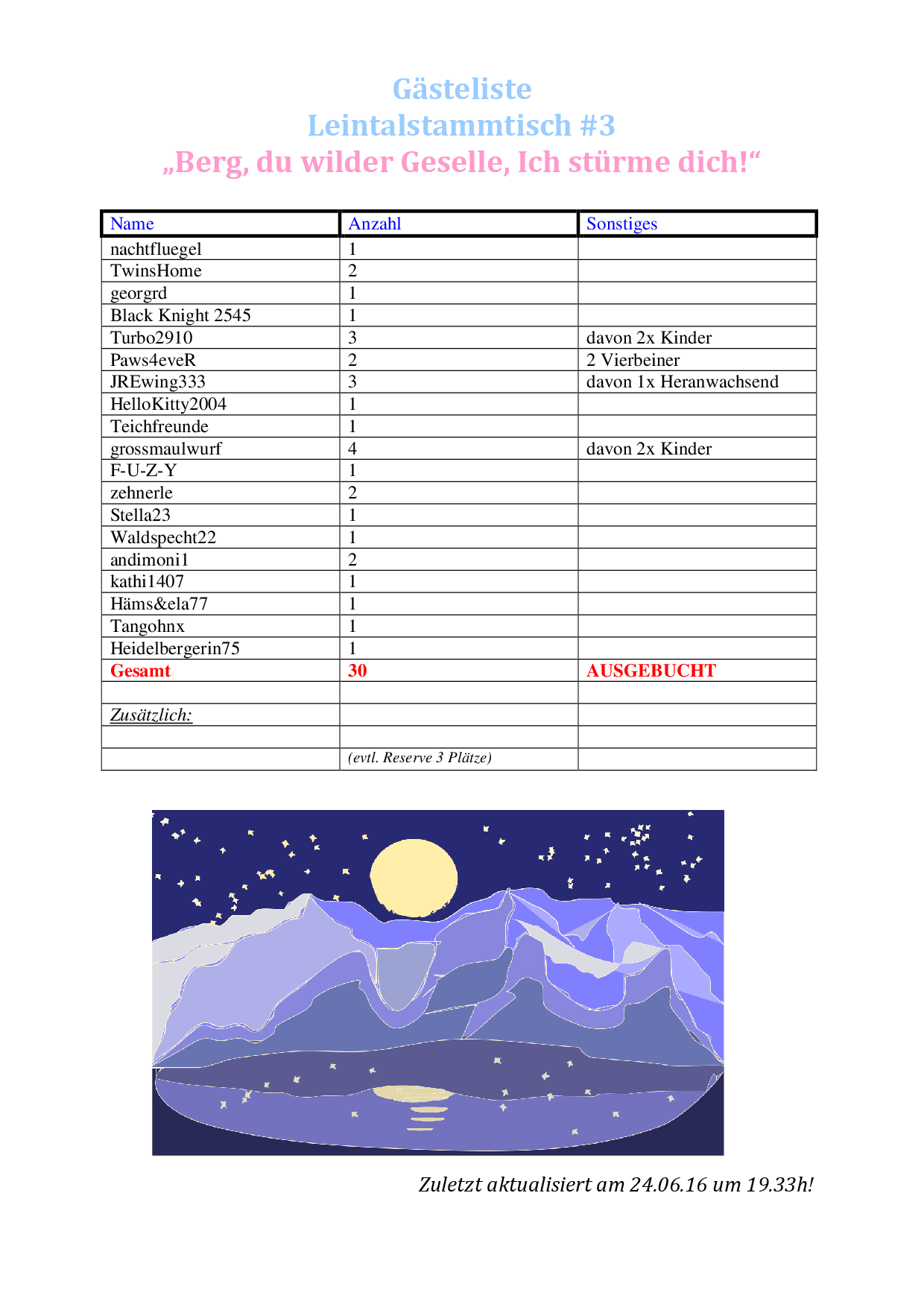 Die Gastwirte bitten um die Durchgabe der genauen Teilnehmerzahl! ;-) Evt. werden wir dann auch wieder Plätze abbestellen! Nur ein kleiner Hinweis für die spontan Kommenden!