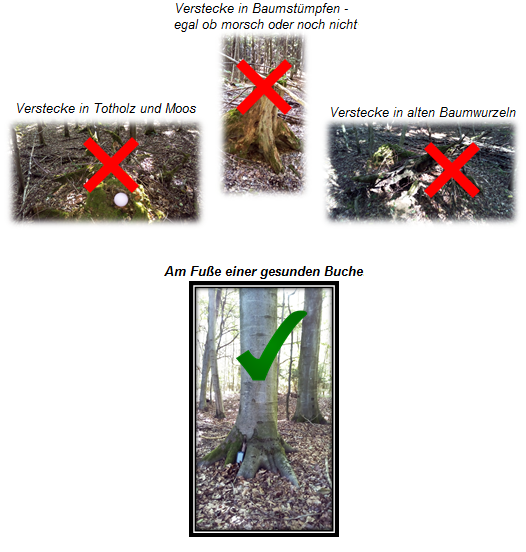 => kein einziges Dosenversteck der Runde befindet sich in Totholz oder in Wurzelstöcken bzw. mossbewachsenen Baumstämmen
