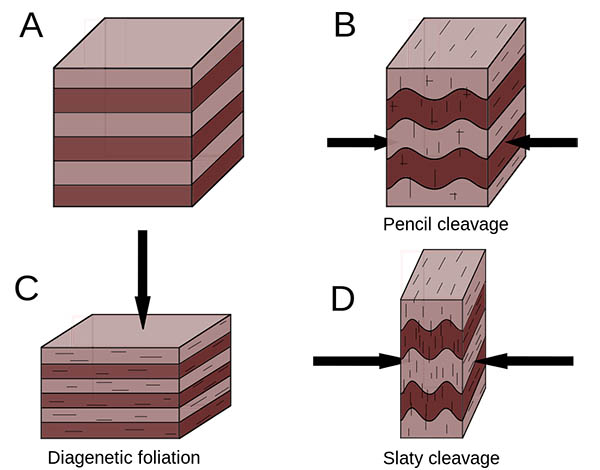 A: original sedimentary rock; B: pencil cleavage; C: diagenetic foliation (parallel to bedding); D: slaty cleavage.