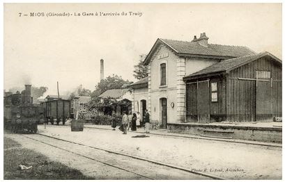 [F] - La gare de Mios a servi au transport des marchandises jusqu'en 1955 et a accueilli des voyageurs jusqu'en 1978. De nombreux poteaux de mines à destination de l'Angleterre issus de la scierie locale ont transité par ses quais. Elle se situe à 5,2 km de la gare de Facture Biganos. Un arrêt facultatif se trouvait au lieu-dit La Saye au km 9. L'ancienne gare est devenue une maison d'habitation. Déclassée en 1979, la ligne a été transformée en piste cyclable dans les années 80 et permet maintenant d'aller jusqu'à Bazas.